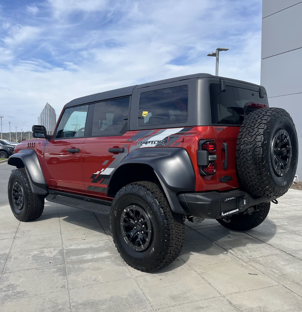 The Ford Bronco Raptor emerges as an unstoppable off-road SUV. It has a 3.0-liter EcoBoost V6 engine matched with a 10-speed automatic transmission. With its high-grade capabilities, the Bronco Raptor has rugged 17-inch Black High-Gloss painted alloy wheels with all-terrain tires ready to take on any road bumps. The Bronco Raptor also has a wide range of handling features, including hill start assist, trail control, trail turn assist, and advanced 4×4 with automatic on-demand engagement.