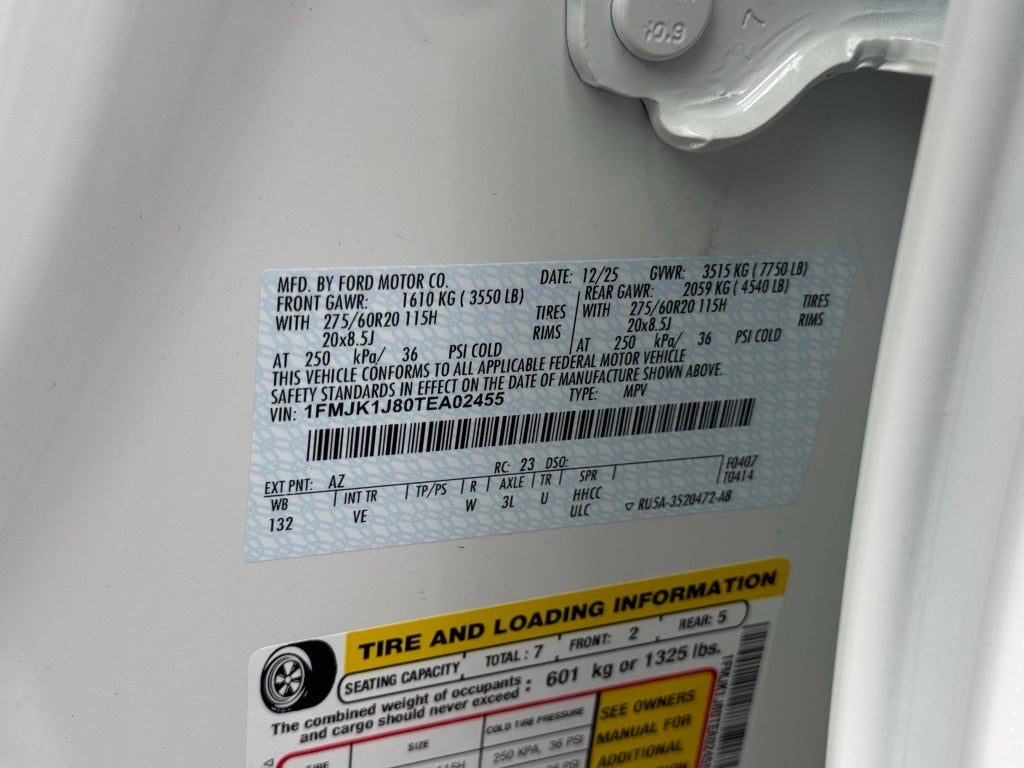 Performance Tires, Adaptive Cruise Control, Blind Spot Warning System, Rear Cross Traffic Alert, Lane Keep Assist, Forward Collision Alert, Wi-Fi Hotspot, Color Touch Screen Display, Backup Camera, Premium Wheels, Expedition Max Active, 4D Sport Utility, EcoBoost 3.5L V6 GTDi DOHC 24V Twin Turbocharged, 10-Speed Automatic, 4WD, White Metallic, Ultra Dark Space Gray Premium Synthetic, 26mm Engine Radiator, 2nd Row Power-Folding Captain's Chairs, 360-Degree Zone Lighting, 3rd Row Flexible Seating (40/20/40), 3rd Row Vinyl Seats, 4-Door Intelligent Access (Lock/Unlock), 4-Wheel Disc Brakes, 6 Speakers, Active Air Dam, ActiveX-Trimmed Front Heated Captain's Chairs, Automatic temperature control, BlueCruise (Equipment + 1-Year + 90-Day Plan), Brake assist, Cloth Front Captain's Chairs, Dual Power-Folding Sideview Mirrors w/Autofold, Electronic Stability Control, Equipment Group 202A Touring Package, Flex Powered Console, Ford Connectivity Package (1-Year Included), Ford Digital Experience, Ford Split Gate, Four wheel independent suspension, Front dual zone A/C, Front Side Laminated Glass, Fully automatic headlights, Heated door mirrors, Heated Steering Wheel, Heavy-Duty Trailer Tow, Integrated Trailer Brake Control, Intersection Assist, Memory Driver Seat, Navigation System, Power Tilt/Telescopic Steering Wheel w/Memory, Pro Power Onboard - 400W, Radio: AM/FM Stereo w/MP3 Capable, Rain Sensitive Windshield Wipers, Rear air conditioning, Reclining 3rd row seat, Remote Keyless entry, Security system, SiriusXM w/360L, Spoiler, USB Ports, Wheels: 20 x 8.5 Bright Machined Aluminum.