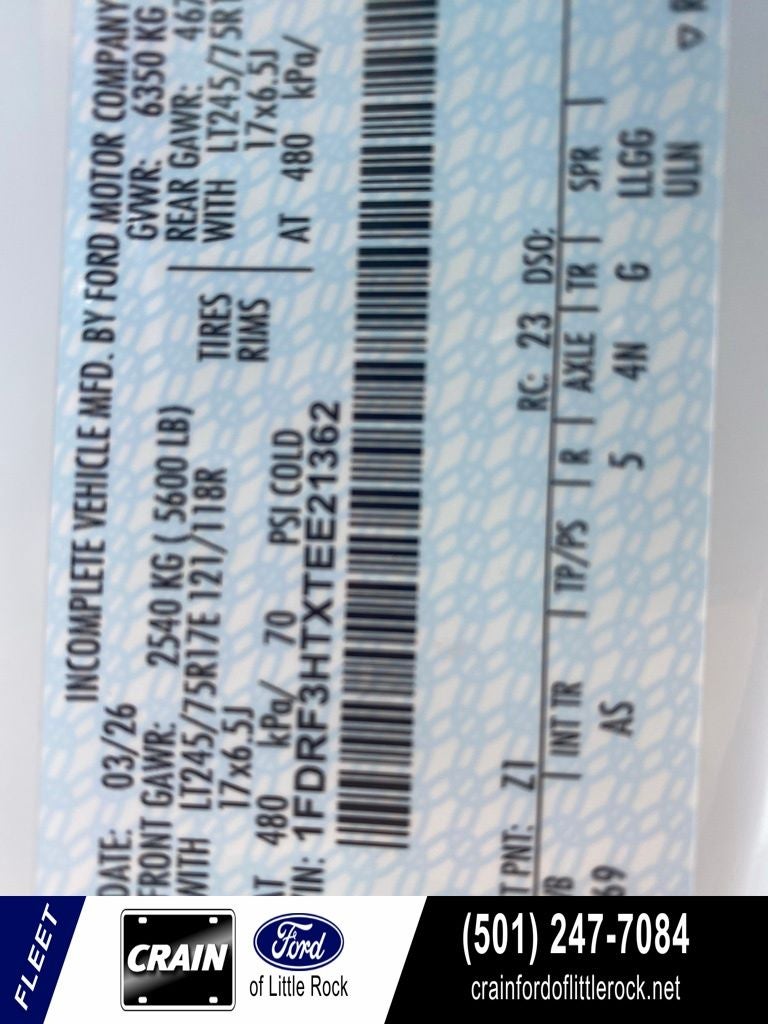 Ford Connectivity Package (1-Year Included), GVWR: 14,000 Lb Payload Package, Internet access capable: 5G Modem - Ford Connectivity Package, XL Chrome Package (Bright Grille, Chrome Front Bumper, Halogen Fog Lamps, and Remote Start), F-350 SuperDuty XL DRW, 2D Standard Cab/Chassis, Power Stroke 6.7L V8 DI 32V OHV Turbodiesel, 10-Speed Automatic, 4WD, Oxford White, Med Dk Slate Hd 40 Vinyl, 17 Argent Painted Steel Wheels, 4 Speakers, ABS brakes, Air Conditioning, Brake assist, Compass, Dual rear wheels, Front Center Armrest w/Storage, Fully automatic headlights, Heated door mirrors, Illuminated entry, Limited Slip with 4.10 Axle Ratio, Low tire pressure warning, Overhead console, Radio: AM/FM Stereo with MP3 Player, Remote keyless entry, Security system, SYNC 4, Traction control, Turn signal indicator mirrors, 4-Wheel Disc Brakes, AM/FM radio, Delay-off headlights, Dual front impact airbags, Dual front side impact airbags, Emergency communication system: SYNC 4 911 Assist, Front anti-roll bar, Front reading lights, Outside temperature display, Overhead airbag, Panic alarm, Passenger cancellable airbag, Passenger vanity mirror, Power door mirrors, Power steering, Power windows, Rear anti-roll bar, Speed control, Steering wheel mounted audio controls, Tachometer, Telescoping steering wheel, Tilt steering wheel, Trip computer, and Variably intermittent wipers.