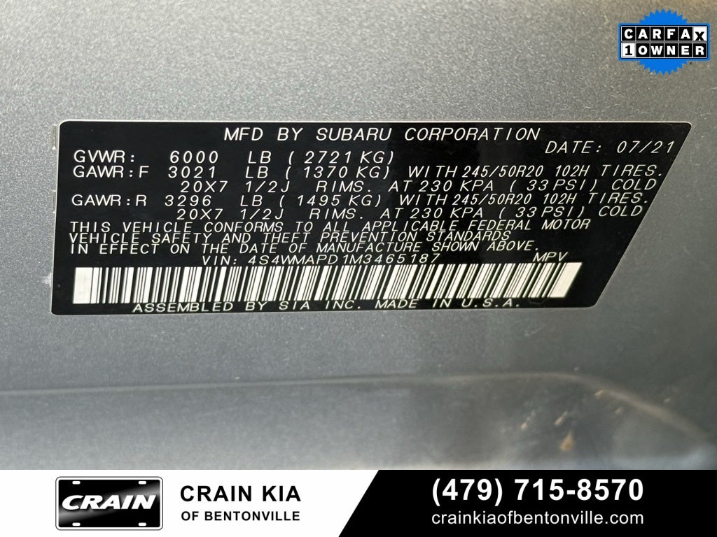Clean Carfax, One Owner, 3rd row seats: bench, 3rd Row Sunshade, 4-Wheel Disc Brakes, 6 Speakers, ABS brakes, Aero Crossbar Set, Air Conditioning, All-Weather Floor Liners, Alloy wheels, AM/FM radio: SiriusXM, Auto High-beam Headlights, Auto-Dimming Exterior Mirror w/Approach Light, Auto-dimming Rear-View mirror, Automatic temperature control, Axle Ratio: 4.44, Brake assist, Bumpers: body-color, Cargo Area Cover, Cargo Net, Cargo Tray, CD player, Compass, Cup Holder Insert, Delay-off headlights, Driver door bin, Driver vanity mirror, Dual front impact airbags, Dual front side impact airbags, Dual Glass Panoramic Power Moonroof, Electronic Stability Control, Emergency communication system: STARLINK Safety and Security (Subscription Required), Exterior Parking Camera Rear, Four wheel independent suspension, Front anti-roll bar, Front Bucket Seats, Front Center Armrest, Front dual zone A/C, Front fog lights, Front reading lights, Fully automatic headlights, Garage door transmitter: HomeLink, Heated door mirrors, Heated Front Bucket Seats, Heated front seats, Heated rear seats, Heated steering wheel, Illuminated entry, Knee airbag, Low tire pressure warning, Memory seat, Navigation System, Occupant sensing airbag, Outside temperature display, Overhead airbag, Overhead console, Panic alarm, Passenger door bin, Passenger vanity mirror, Perforated Leather-Trimmed Upholstery, Power door mirrors, Power driver seat, Power Liftgate, Power passenger seat, Power steering, Power windows, Radio data system, Radio: Subaru STARLINK 8.0 Multimedia Nav System, Radio: Subaru STARLINK 8.0 Multimedia Plus System, Rear air conditioning, Rear anti-roll bar, Rear reading lights, Rear window defroster, Rear window wiper, Reclining 3rd row seat, Remote keyless entry, Security system, Split folding rear seat, Spoiler, STARLINK/Apple CarPlay/Android Auto, Steering wheel mounted audio controls, Tachometer, Technology Package, Telescoping steering wheel, Tilt steering wheel, Traction control, Trip computer, Turn signal indicator mirrors, Variably intermittent wipers, Wheels: 20 x 7.5 J Dk Gray Alloy w/Machine Finish.