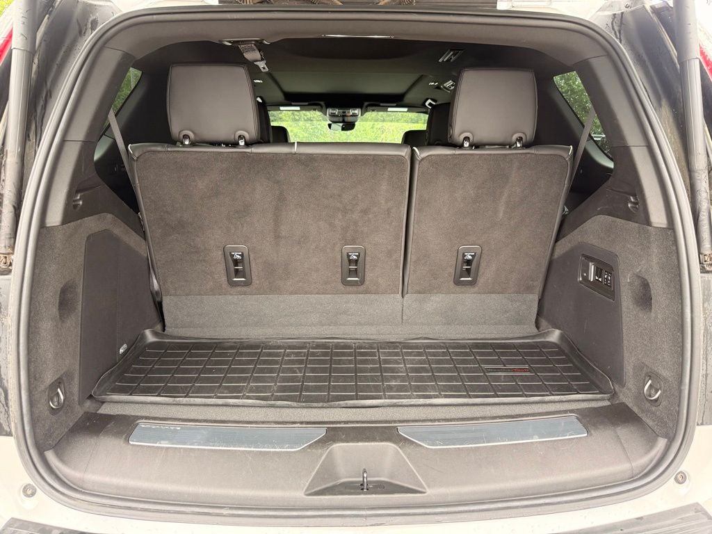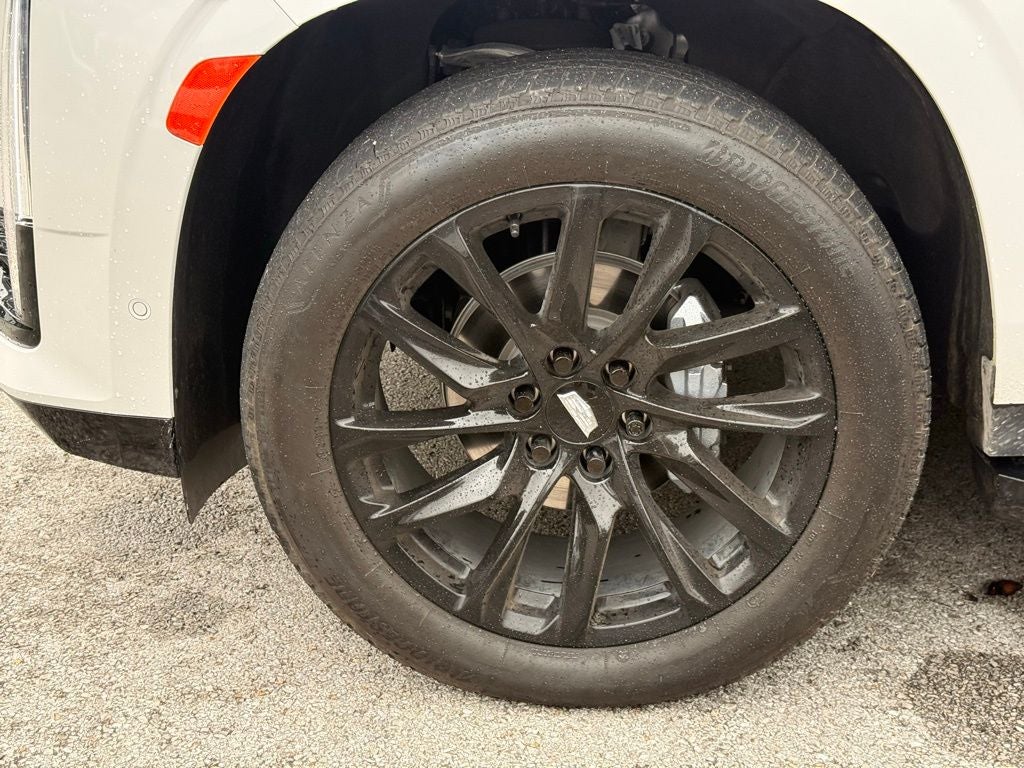 - Crystal White Tricoat exterior with the Onyx Package, featuring monochrome Cadillac emblems, a gloss black Escalade nameplate, and 22 12-spoke gloss black alloy wheels