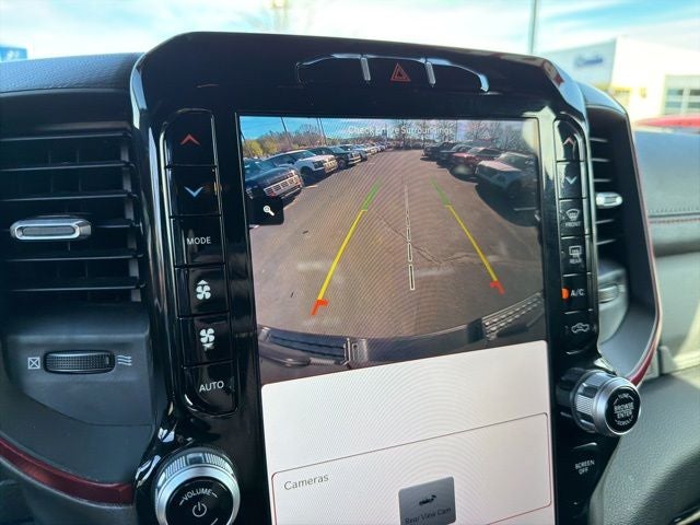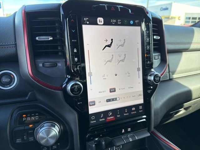 Bluetooth®, Safety Package, 1500 Rebel, 4D Crew Cab, HEMI 5.7L V8 Multi Displacement VVT eTorque, 8-Speed Automatic, 4WD, Diamond Black Crystal Pearlcoat, Red/Black w/Cloth/Vinyl Low Back Bucket Seats or Lux Leather Trimmed Bucket Seats, 12 Touchscreen Display, 2nd Row In Floor Storage Bins, 3.92 Rear Axle Ratio, 4 Way Front Headrests, 4-Wheel Disc Brakes, 48V Belt Starter Generator, 4G LTE Wi-Fi Hot Spot, 6 Speakers, 9 Amplified Speakers w/Subwoofer, ABS brakes, Active Noise Control System, Air Conditioning, AM/FM radio: SiriusXM with 360L, Apple CarPlay, Apple CarPlay/Android Auto, Auto-Dimming Exterior Driver Mirror, Auto-dimming Rear-View mirror, Automatic temperature control, Black Exterior Mirrors, Black Premium Power Mirrors, Brake assist, Bucket Seats, Class IV Receiver Hitch, Cloth/Vinyl Low Back Bucket Seats, Compass, Connected Travel & Traffic Services, Connectivity - US/Canada, Convex Wide-Angle Exterior Mirror Insert, Delay-off headlights, Disassociated Touchscreen Display, Driver door bin, Dual Exhaust w/Black Tips, Dual front impact airbags, Dual front side impact airbags, Electronic Stability Control, Emergency communication system: SiriusXM Guardian, Exterior Mirrors Courtesy Lamps, Exterior Mirrors w/Heating Element, Exterior Mirrors w/Supplemental Signals, Foam Bottle Insert (Door Trim Panel), For Details, Visit DriveUconnect.com, For More Info, Call 800-643-2112, Front anti-roll bar, Front Bucket Seats, Front Center Armrest w/Storage, Front dual zone A/C, Front fog lights, Front reading lights, Front Seat Back Map Pockets, Front wheel independent suspension, Full Length Upgraded Floor Console, Fully automatic headlights, Global Telematics Box Module (TBM), Google Android Auto, GPS Antenna Input, GPS Navigation, HD Radio, Heated door mirrors, Heated Front Seats, Heated Steering Wheel, Heavy-Duty Engine Cooling, HEMI Badge, Illuminated entry, Integrated Center Stack Radio, Integrated Voice Command w/Bluetooth®, Leather steering wheel, Low tire pressure warning, Mopar Black Tubular Side Steps, Navigation System, Occupant sensing airbag, Off-Road Information Pages, Outside temperature display, Overhead airbag, Overhead console, Panic alarm, ParkView Rear Back-Up Camera, Passenger door bin, Passenger vanity mirror, Passive Tuned Mass Damper, Power 2-Way Driver Lumbar Adjust, Power 8-Way Driver Seat, Power Adjustable Pedals, Power door mirrors, Power steering, Power windows, Power-Folding Mirrors, Radio data system, Radio: Uconnect 5 Nav w/12.0 Display, Radio: Uconnect 5 Nav w/8.4 Display, Rear 60/40 Folding Seat, Rear anti-roll bar, Rear Dome w/On/Off Switch Lamp, Rear Power Sliding Window, Rear seat center armrest, Rear step bumper, Rear Wheelhouse Liners, Rear Window Defroster, Rebel Level 1 Equipment Group, Remote keyless entry, SiriusXM Radio Service, SiriusXM w/360L, Speed control, Split folding rear seat, Steering wheel mounted audio controls, Sun Visors w/Illuminated Vanity Mirrors, Tachometer, Telescoping steering wheel, Tilt steering wheel, Traction control, Trailer Brake Control, Trip computer, Universal Garage Door Opener, USB Host Flip, Variably intermittent wipers, Voltmeter, Wheels: 18 x 8.0 Painted Mid-Gloss Black.