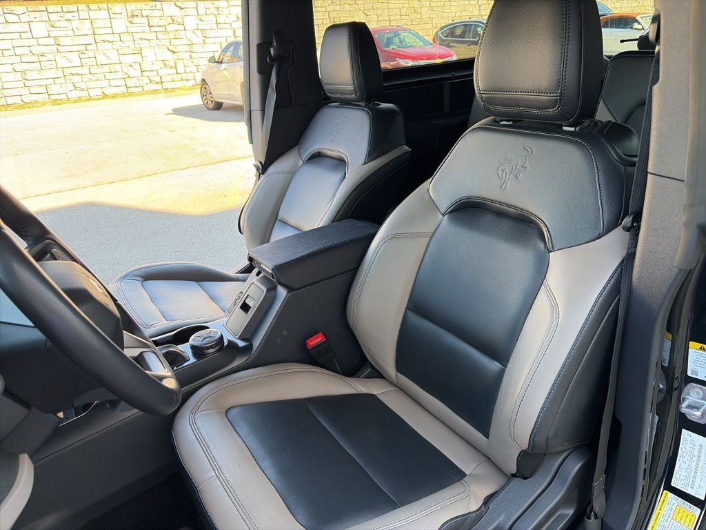 Bronco Wildtrak 754A PKG HIGH LUX, 2D Sport Utility, 2.7L EcoBoost V6, 10-Speed Automatic, 4WD, Shadow Black, Black Leather, 10 Speakers w/Subwoofer, 360-Degree Camera, 4-Wheel Disc Brakes, 4.7 Axle Ratio, 7 Speakers, ABS brakes, Adaptive Cruise Control, Additional Sound Deadening, Air Conditioning, Alloy wheels, AM/FM radio: SiriusXM with 360L, AM/FM Stereo, Auto High-beam Headlights, Auto-dimming Rear-View mirror, Automatic temperature control, Brake assist, Brush Guard, Compass, Connected Navigation, Convertible HardTop, Convertible roof lining, Delay-off headlights, Driver door bin, Driver vanity mirror, Dual front impact airbags, Dual front side impact airbags, Electronic Stability Control, Emergency communication system: 911 Assist, Equipment Group 354A High/Lux Package, Evasive Steering Assist, Exterior Parking Camera Rear, Front anti-roll bar, Front Bucket Seats, Front Center Armrest, Front dual zone A/C, Front fog lights, Front License Plate Bracket, Front Parking Sensors, Front reading lights, Front wheel independent suspension, Fully automatic headlights, Glass rear window, Heated door mirrors, Heated front seats, Heated Leather-Trimmed/Vinyl Bucket Seats, Heated Steering Wheel, Illuminated entry, Information on Demand Panel, Integrated roll-over protection, Leather Shift Knob, Low tire pressure warning, Navigation system: Connected Navigation, Occupant sensing airbag, Outside temperature display, Overhead airbag, Overhead console, Panic alarm, Passenger door bin, Passenger vanity mirror, Powder Coated Tube Step, Power door mirrors, Power steering, Power windows, Radio data system, Radio: B&O Sound System by Bang & Olufsen, Rear window defroster, Rear window wiper, Remote keyless entry, Security system, Sideview Mirrors, SiriusXM Radio w/360L, Speed control, Split folding rear seat, Steering wheel mounted audio controls, SYNC 4, Tachometer, Telescoping steering wheel, Tilt steering wheel, Traction control, Trip computer, Universal Garage Door Opener, Variably intermittent wipers, Voltmeter, Wheels: 17 Black High Gloss-Painted Aluminum, Wireless Charging Pad.